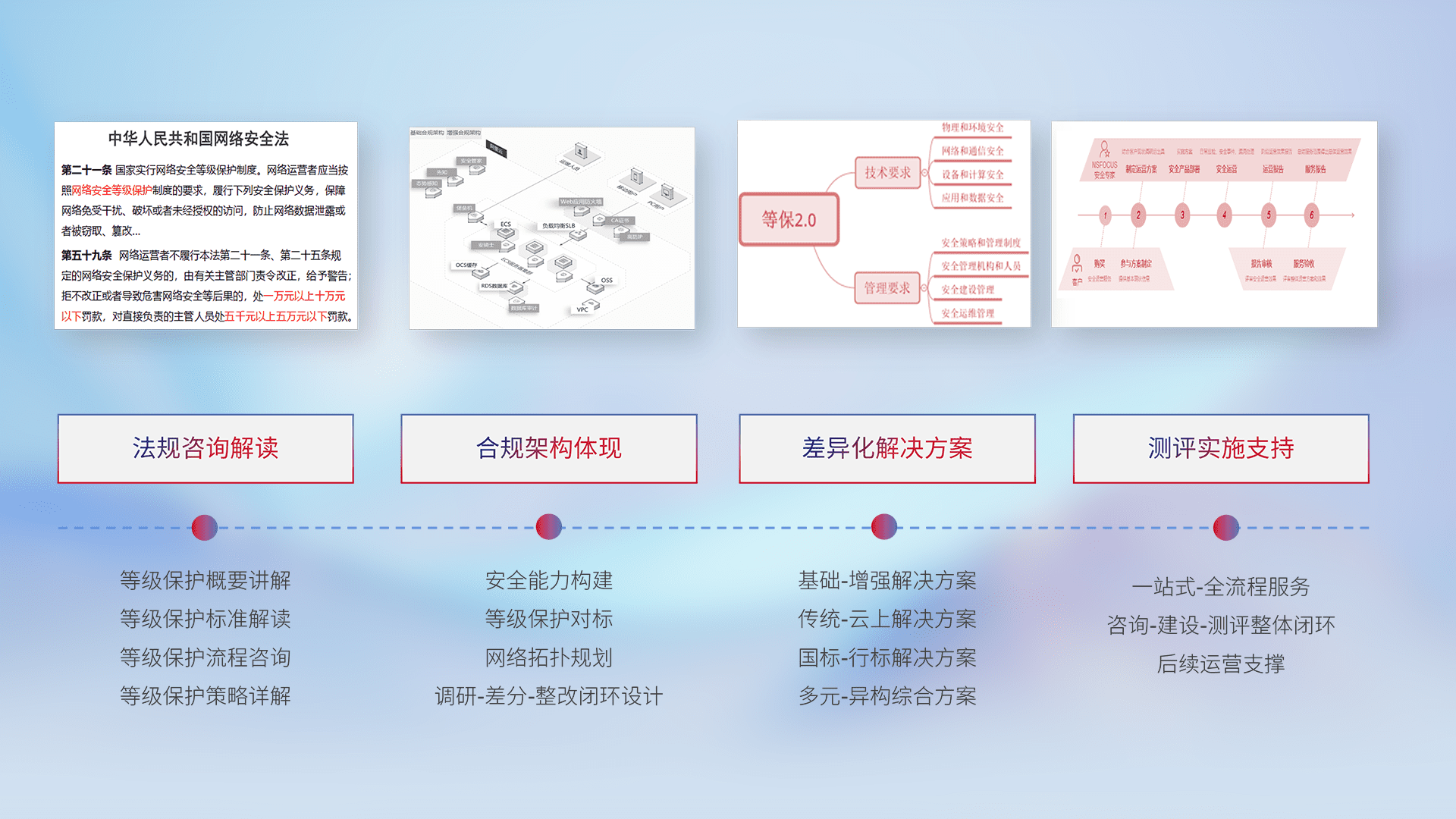 通过专业的法律咨询解读、、、合规架构体现、、、、差异化解决方案、、、、测试实施支持等服务,,,为客户量身打造等保合规体系。。。